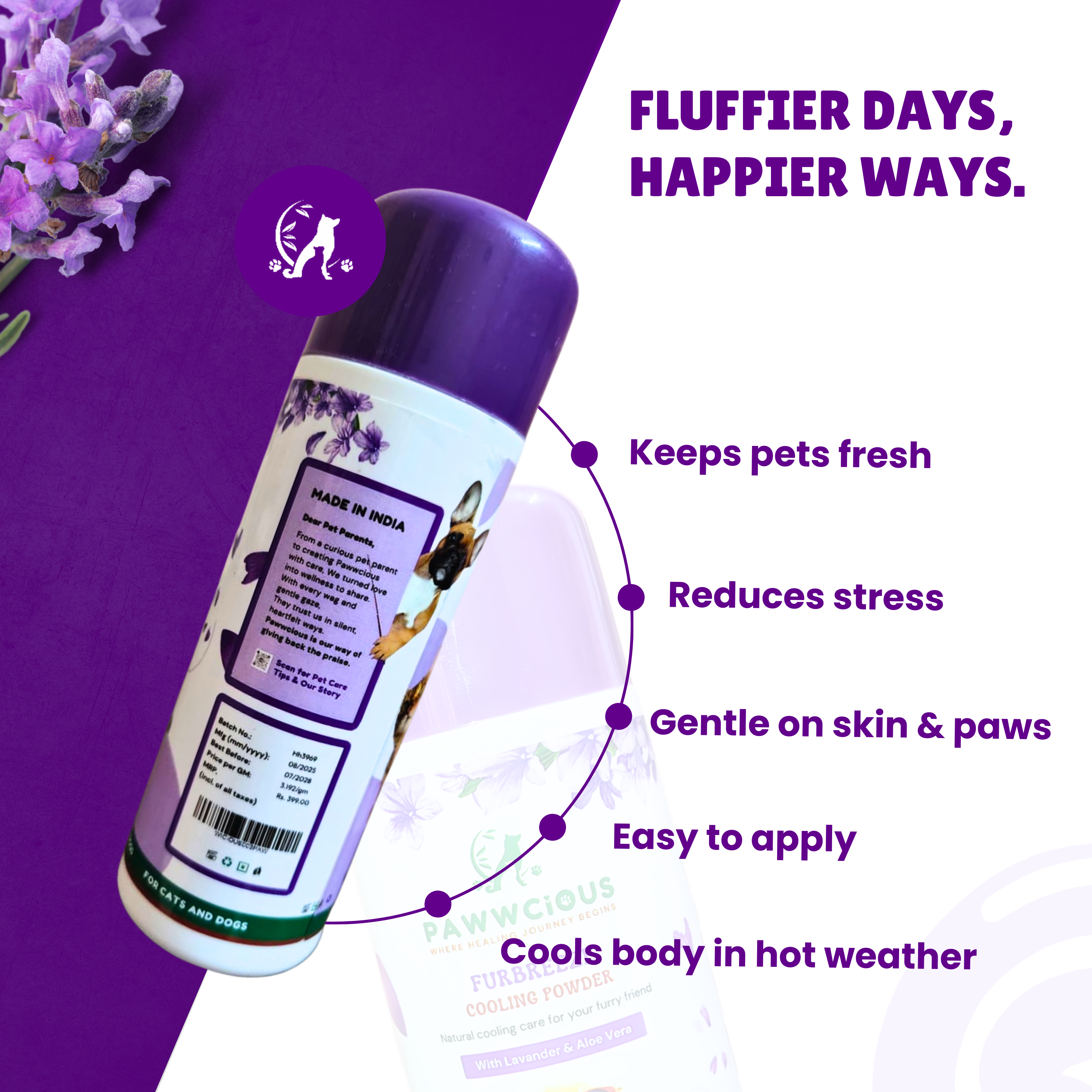 Pawwcious Furbreeze Heat Cooling Powder is specially formulated to keep your pet fresh, comfortable, and protected during hot and humid days. Infused with soothing Lavender and Aloe Vera extracts, it gently calms the skin and reduces irritation. Geranium oil naturally refreshes while providing a pleasant, calming scent. With Propoxur for effective protection against ticks and fleas, this powder not only cools but also defends—keeping your furry friend itch-free, odor-free, and happy all day long.
