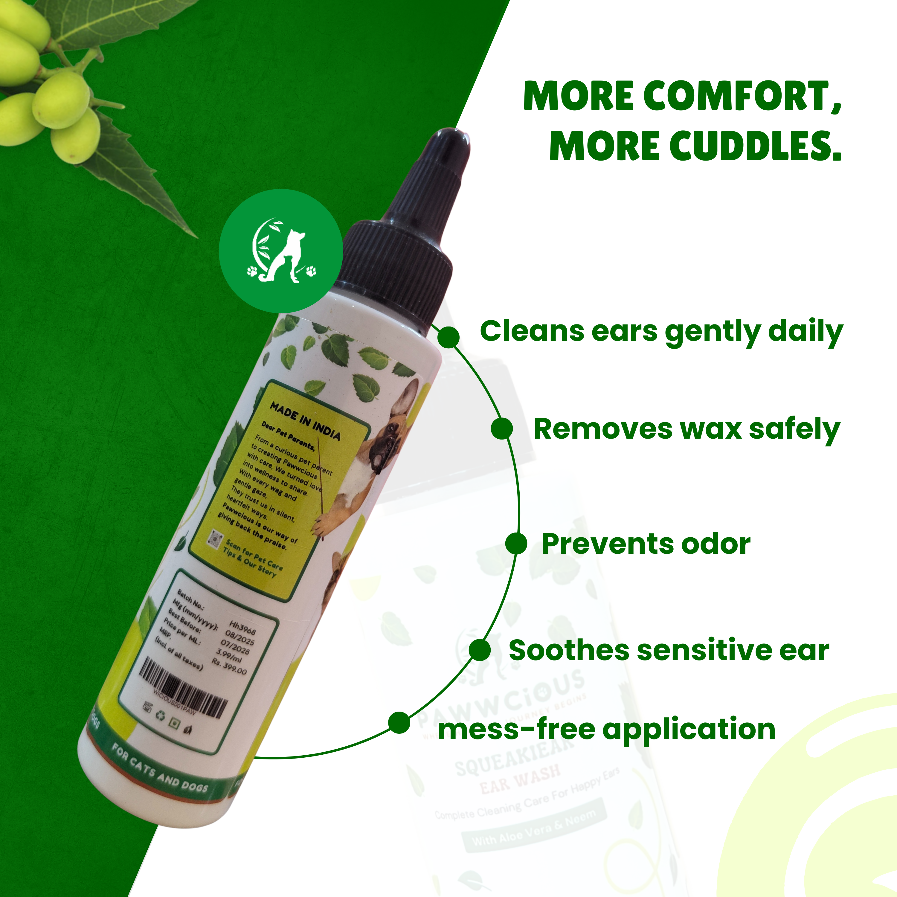 Squeakear Earwash is a gentle yet effective herbal formula that cleans, soothes, and protects your pet’s ears. Enriched with Aloe Vera, Neem, Tea Tree Oil, and Apple Cider Vinegar, it removes wax, controls odor, and helps prevent infections—keeping ears fresh, healthy, and irritation-free with every use.